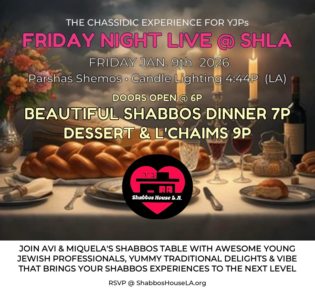 Meet Avi and Miquela! In 2020, as a response to our neighborhood’s growing need for YJPs to be hosted, we opened our Chabad House; serving yummy Kosher meals and more in a welcoming non-judgmental environment; helping young Jews get married and travelers enjoy a heimish experience. Whether you’re local or on visiting, Shabbos House LA is the space to enjoy being Jewish.